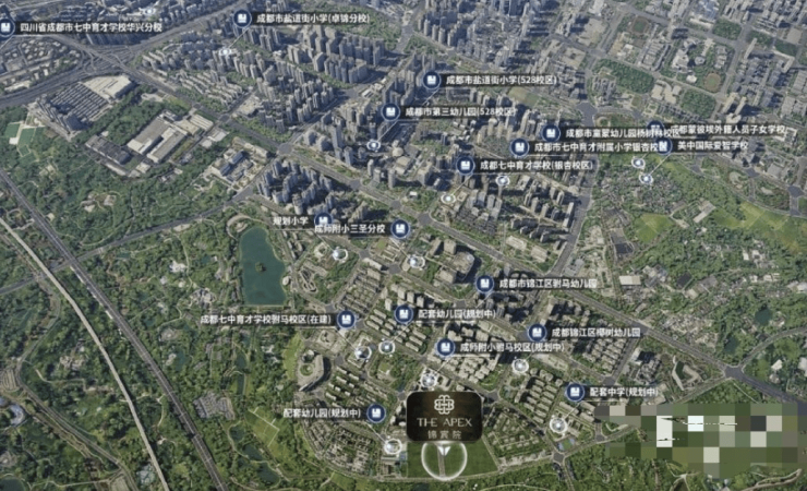 、2所成师附幼系2所七中育才系;幼儿园等近20所学校4所国际学校、7所。、何多苓等艺术IP许燎源博物馆、蓝顶,人文风致与内情群落交错顶级,都市的将来开拓一座。